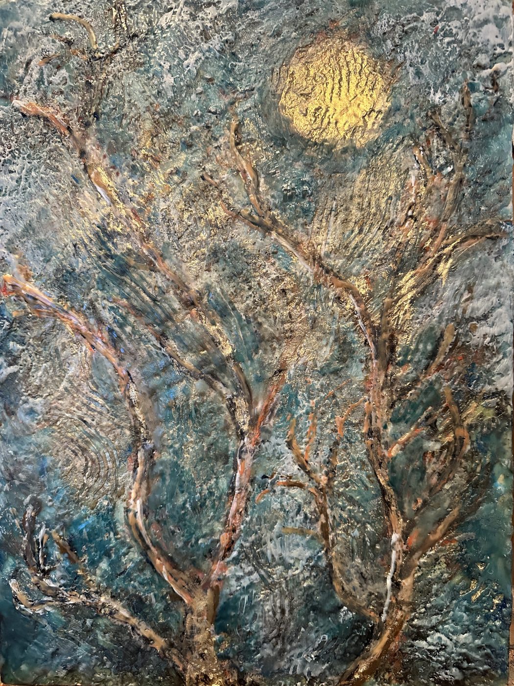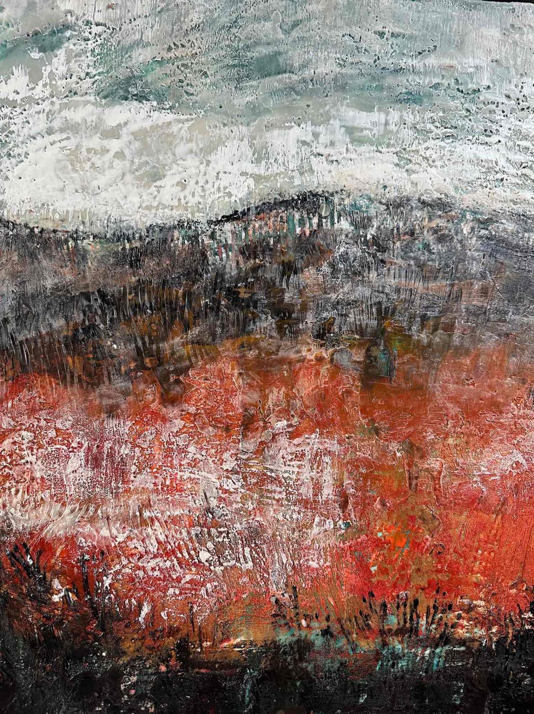 Peinture à l' encaustique ou à la cire chaude. La cire et la résine se mêlent aux pigments, se posent sur la toile guidées par la main et le pinceau, coulent et se figent pour former des scènes et des paysages parfois presque figuratifs ou plus abstraits… et cette peinture solide comme la pierre peut ensuite se graver, se creuser, se griffer , les trous  se combler  ...  ou simplement l'ensemble peut se lisser avec la chaleur..chaque tableau est un voyage dans la matière ...